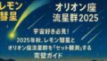 レモン彗星(C/2025 A6)の観測ピークは2025年10月下旬〜11月上旬。これに対し、オリオン座流星群の活動極大は10月21日頃と予測されています。